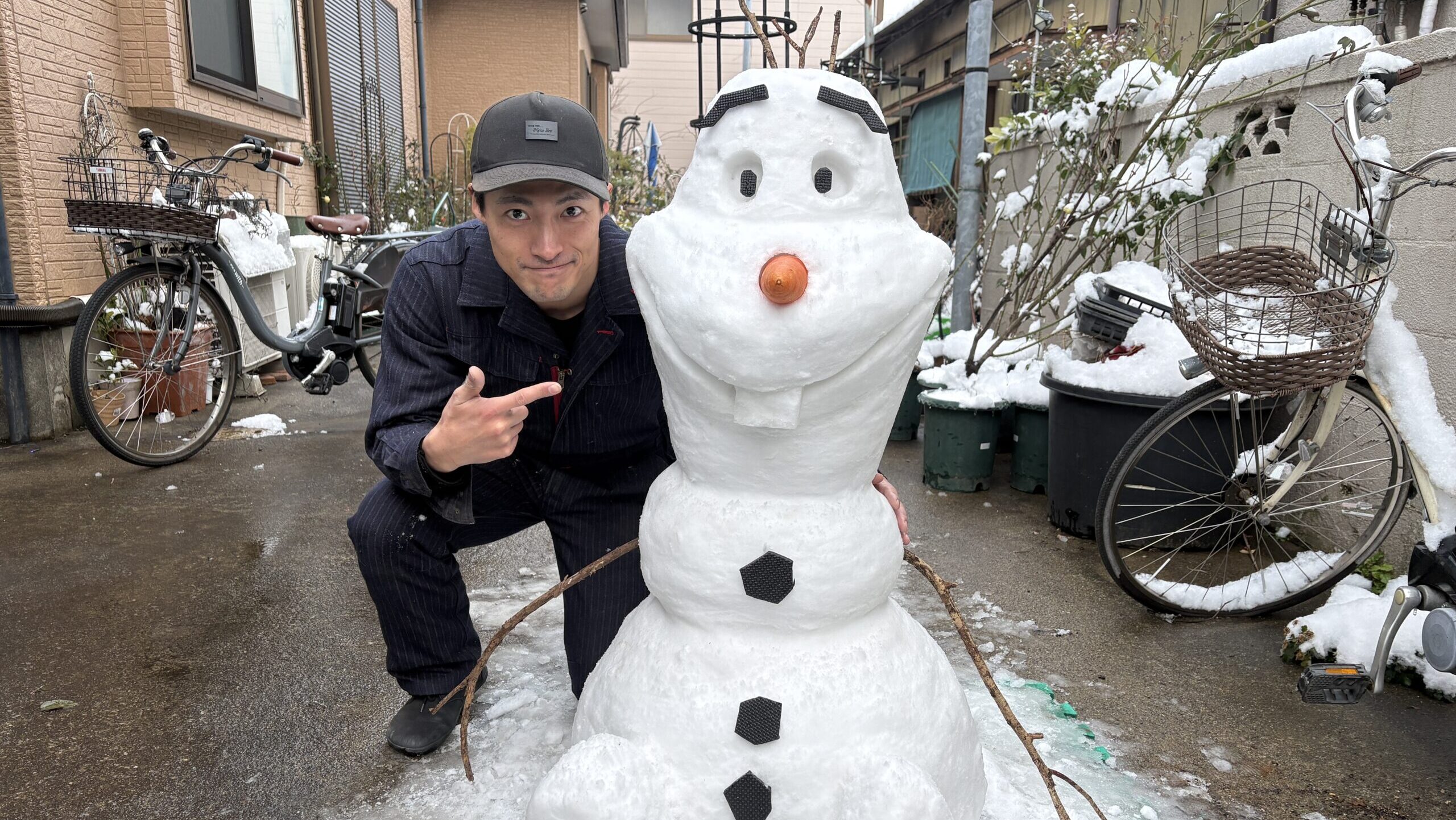2026年2月の雪。34歳の父が3時間かけて本気で「オラフ」を彫り上げた